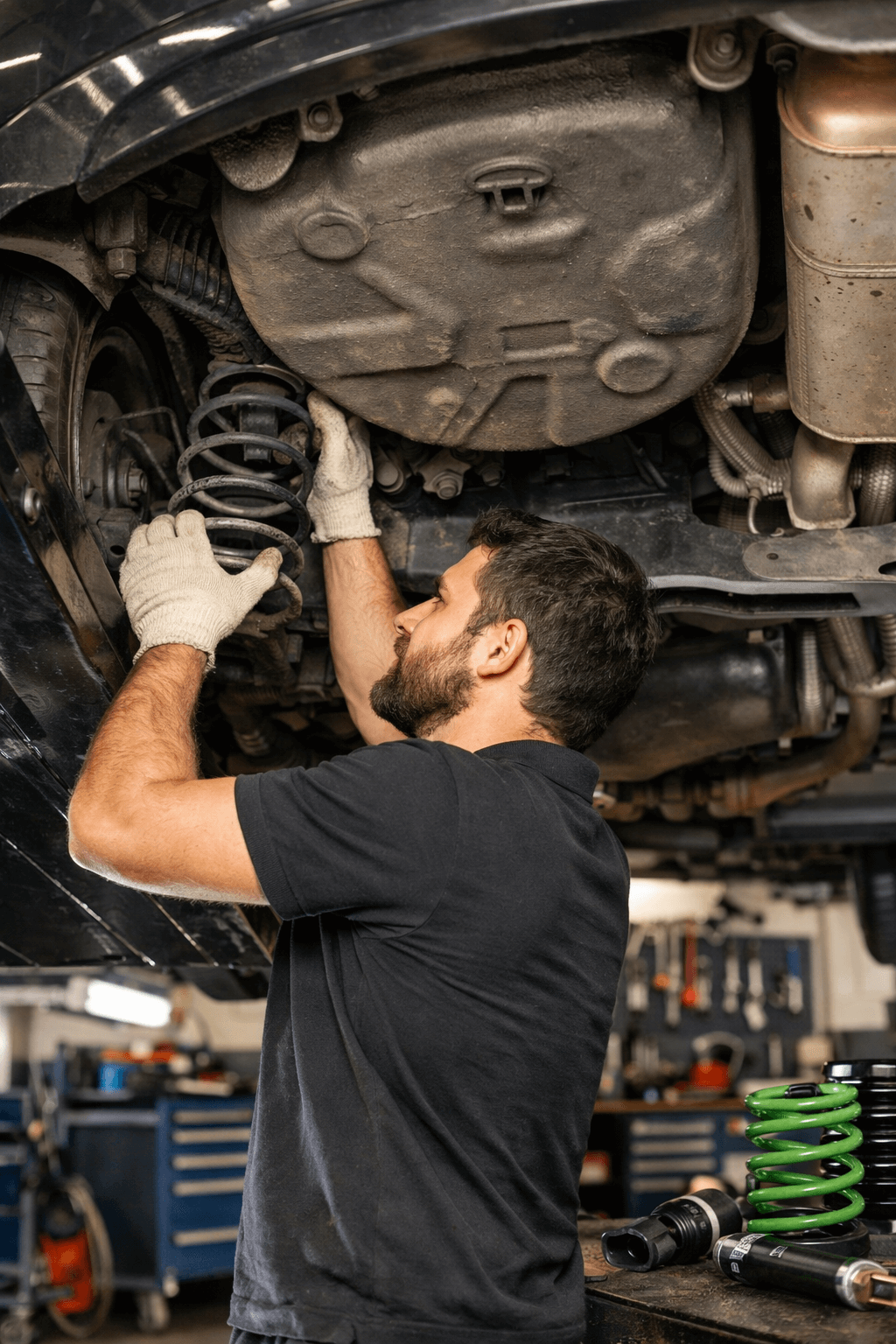 In unserer Werkstatt in Berlin-Reinickendorf prüfen wir Federung, Achsgeometrie und Dämpferleistung digital. Wir reparieren oder ersetzen verschlissene Fahrwerkskomponenten und stellen die Achsgeometrie exakt ein.